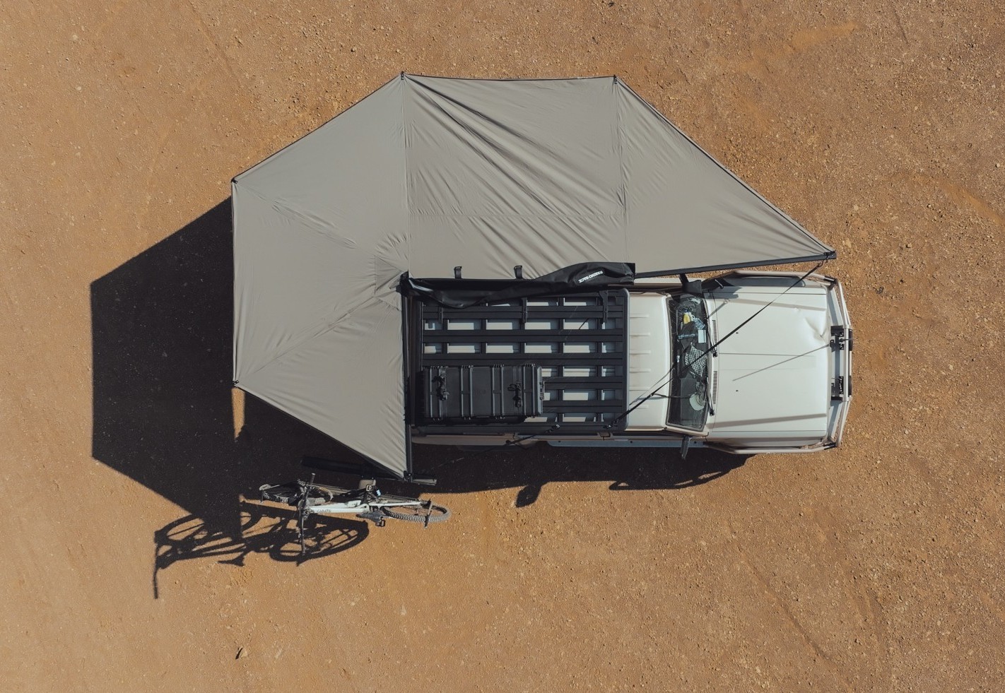 L’auvent Rhino‑Rack Batwing 270° autoportant (côté gauche) offre une très grande zone d’ombrage de 12,3 m² autour du véhicule sans avoir besoin de piquets externes. Sa structure autoportante avec poteaux intégrés assure stabilité et rapidité d’installation, tandis que son tissu Ripstop résistant protège efficacement contre le soleil, la pluie et les UV.