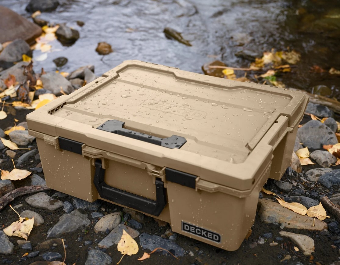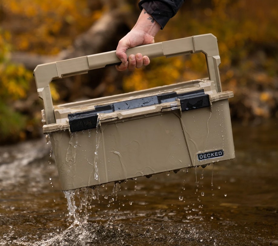 Boîte à outils Halfrack 32 en beige avec fermoirs noirs. Non compatible avec les tiroirs DECKED de première génération.